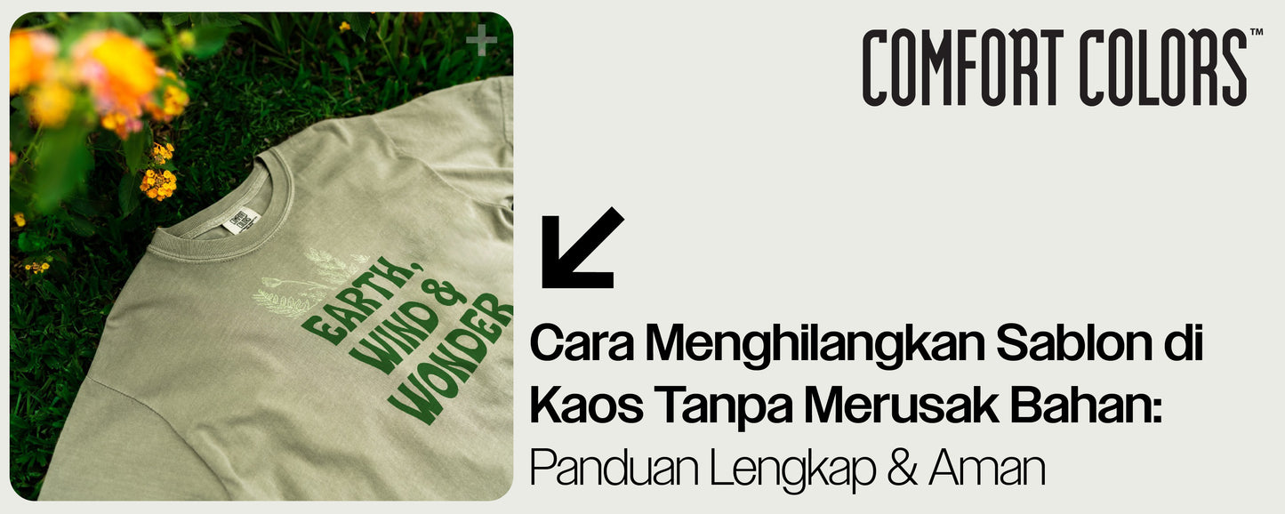 Menghapus sablon membutuhkan ketelitian agar kaos tetap awet dan tidak rusak. Teknik yang salah dapat merusak serat, mengubah warna, bahkan menimbulkan lubang. Jika Anda berencana reprint, gunakan kaos dasar yang siap cetak seperti: Katun Heavyweight Mediumweight CVC (Katun–Poly) Jenis-Jenis Sablon yang Umum di Kaos Rubber: Fleksibel, bertekstur karet, mudah dilunakkan oleh panas. Plastisol: Tebal dan tidak menyerap; membutuhkan panas/solven lebih tinggi. DTG: Tinta masuk ke serat kain; sangat sulit dihapus bersih. Polyflex (Vinyl): Lapis film yang dipress; mudah dikupas dengan panas. Untuk kaos premium dan warna lebih kaya, pertimbangkan: Comfort Colors American Apparel® 1301 Kenapa Menghapus Sablon Bisa Merusak Kaos?...